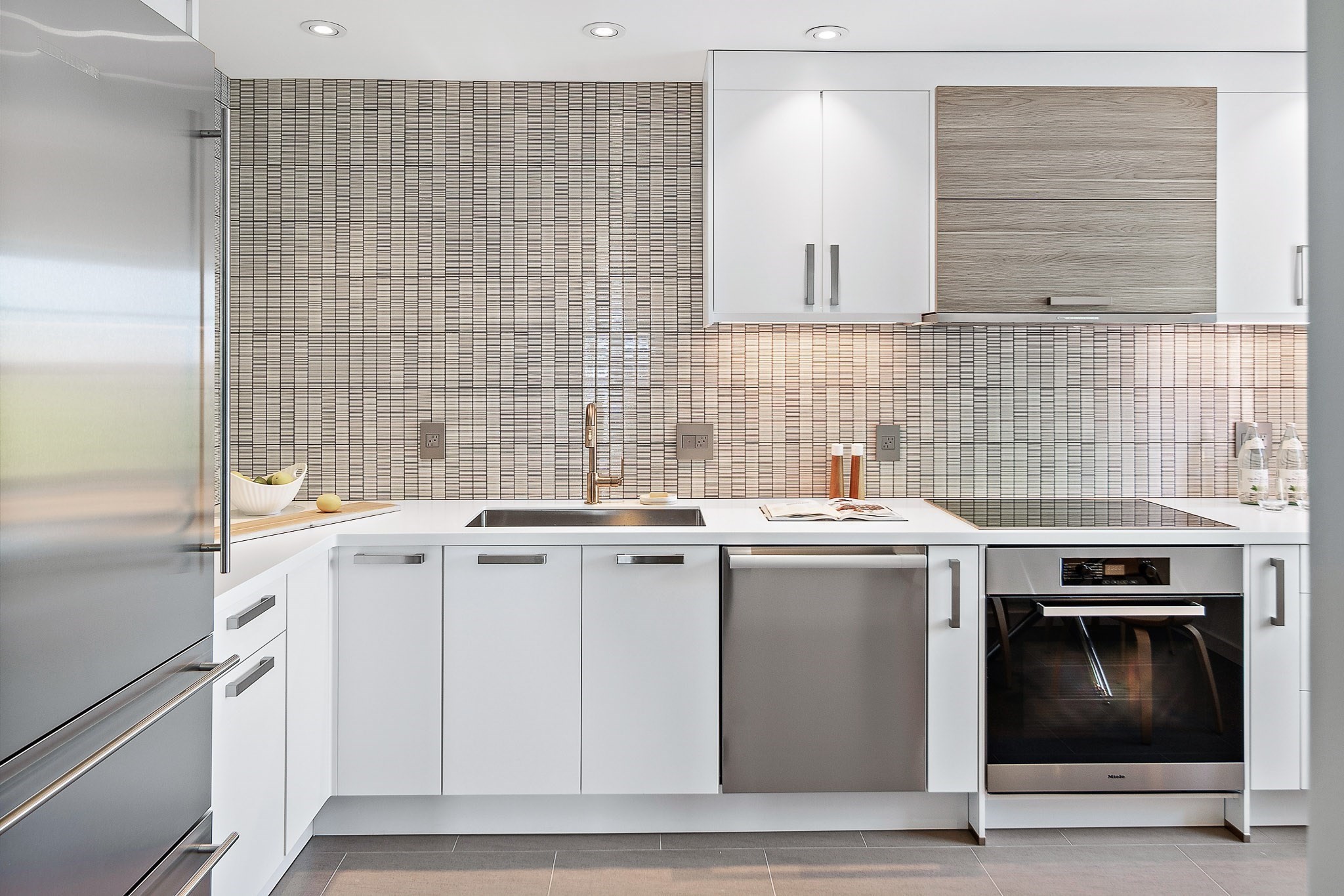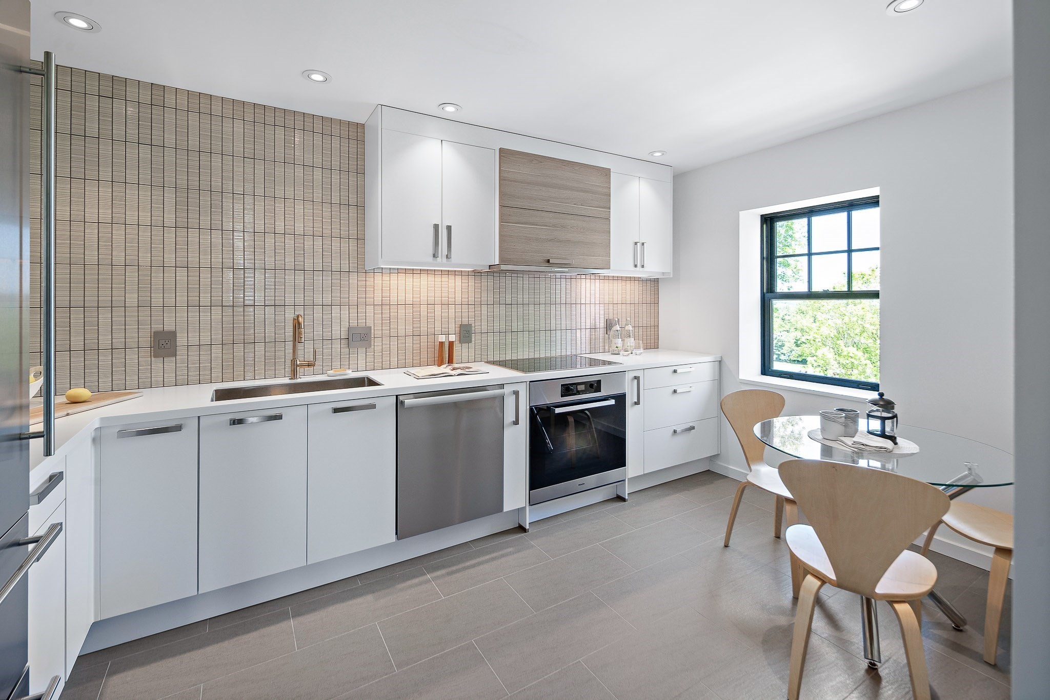 Payson Estate. Top-floor 2 bedroom, 2.5 bathroom condominium with panoramic Boston skyline views in Elevator-Building. Professionally-designed and gut-renovated, this corner unit merges Tudor Architecture with a modern minimalist interior. Bright and airy throughout with 3-exposures, cathedral ceilings, skylights, wide plank flooring, new custom windows & doors by Kolbe and Kolbe, kitchen cabinets by Nobilia of Germany & stainless steel appliances by Miele & Liebherr. Spacious master bedroom suite features a walk-in shower, radiant floors and custom wardrobe by Fimes of Italy. Other amenities include full-size in-unit laundry, new heating/air-conditioning, deeded parking along with guest parking. Spacious walk-in storage room for all your downsizing woes. Easy walk to cafes & shops in Cushing Square with public transport to Cambridge. South-facing pool for summer get-togethers. A tranquil and unique setting.